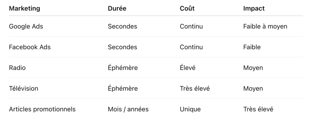 Contrairement à la publicité numérique, qui disparaît après quelques secondes, un article promotionnel :